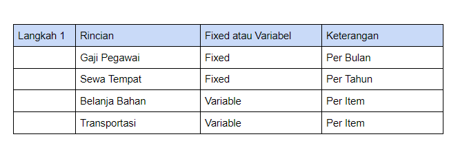 Setelah menentukan jenis biaya, langkah selanjutnya adalah menentukan besaran biaya dari tiga komponen utama, yakni Variable Cost, Fixed Cost, dan Harga Produk. Contohnya sebagai berikut: